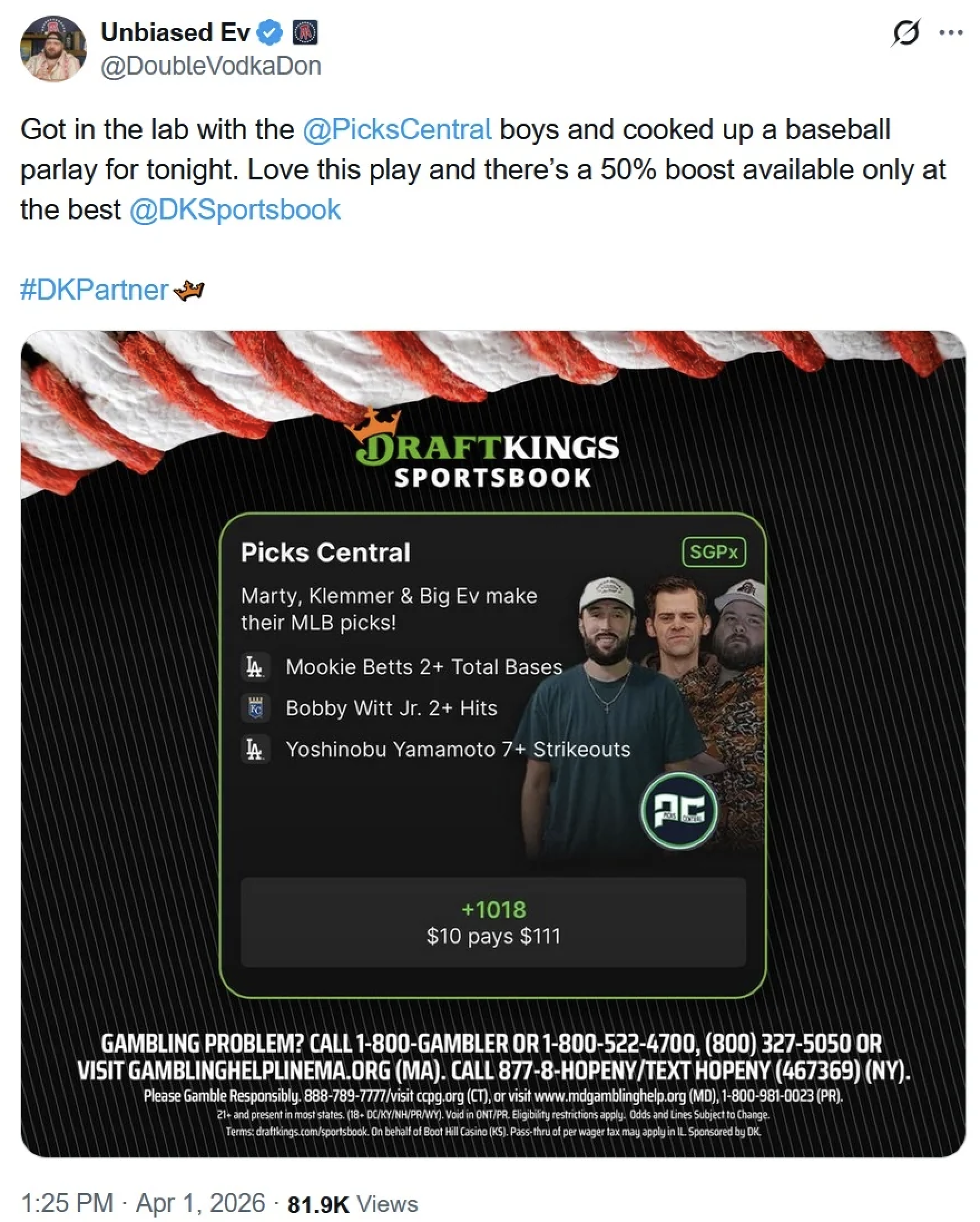 Additionally, DraftKings’ Picks Central parlays no longer feature McDowell in promotional materials.