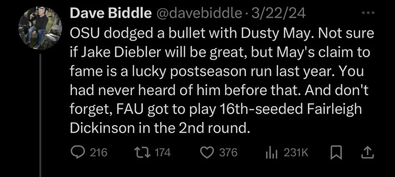 “OSU dodged a bullet with Dusty May,” Biddle wrote. “Not sure if Jake Diebler will be great, but May’s claim to fame is a lucky postseason run last year. You had never heard of him before that. And don’t forget, FAU got to play 16th-seeded Fairleigh Dickinson in the 2nd round.”