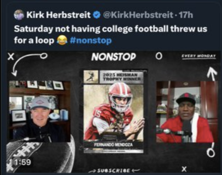 If you go back and listen to the podcast clip that was deleted from the beginning of their show, Kirk Herbstreit and Joey Galloway don’t actually say that there wasn’t any football last weekend. Rather, it’s more their reflections about being home for the first time since August. Kirk Herbstreit is a huge fan of former College GameDay guest picker Nate Bargatze and was invited to one of his shows in Nashville. After a discussion of their weekend, it was straight into Fernando Mendoza winning the Heisman, the Michigan drama, and the College Football Playoff, skipping past Army-Navy and the other games from the weekend.